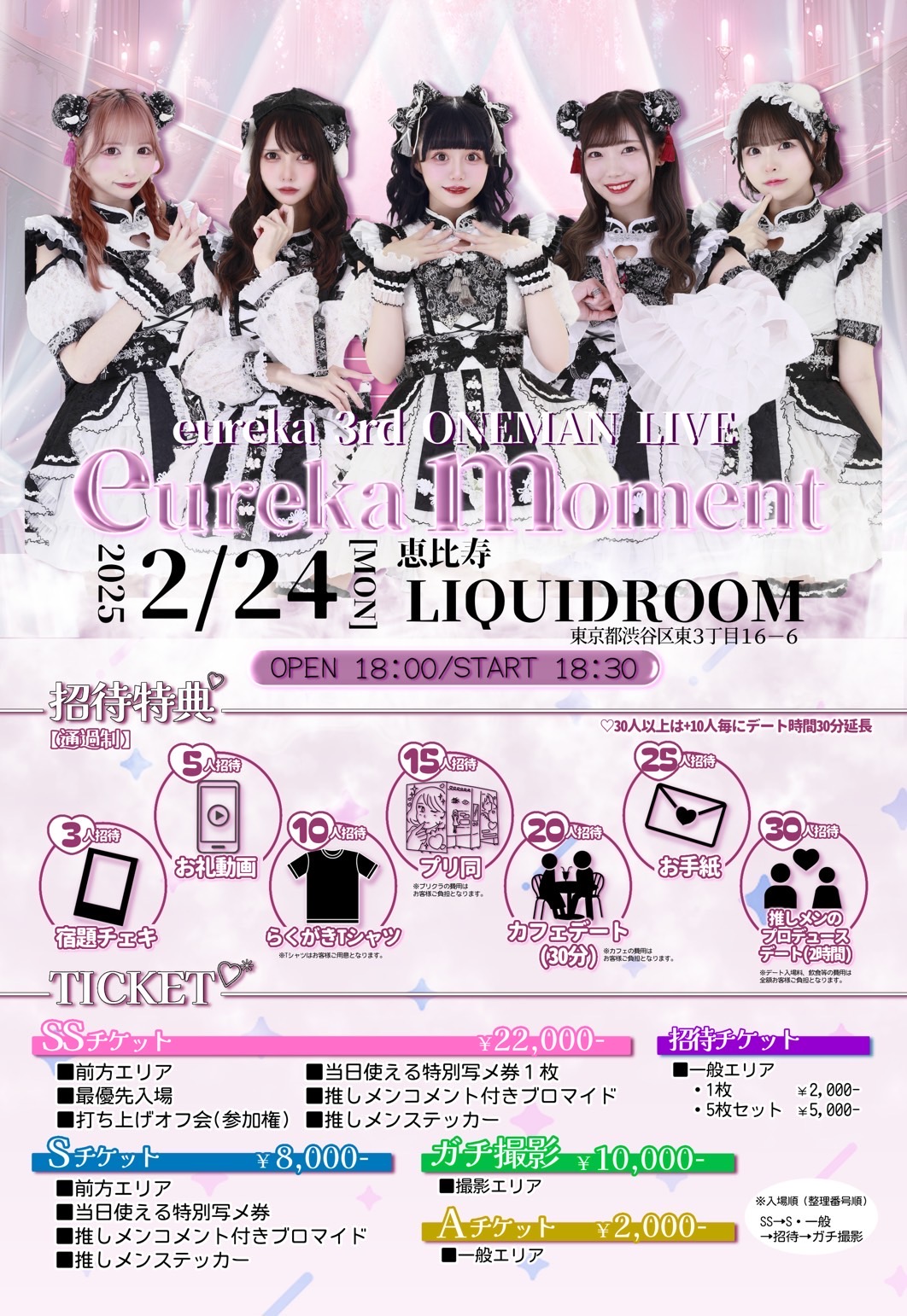 2025.02.24MON eureka eureka moment OPEN 18:00 START 18:30 ADV SS席 ¥22,000 (税込・ドリンクチャージ別)S席 ¥8,000 (税込・ドリンクチャージ別)A席 ¥2,000 (税込・ドリンクチャージ別)撮影席 ¥10,000 (税込・ドリンクチャージ別)招待1枚 ¥2,000 (税込・ドリンクチャージ別)、5枚セット ¥5,000 (税込・ドリンクチャージ別) TICKET ※女性エリア、撮影エリアあり INFO NEXTROAD 03(5114)7444 (平日14:00-18:00)
