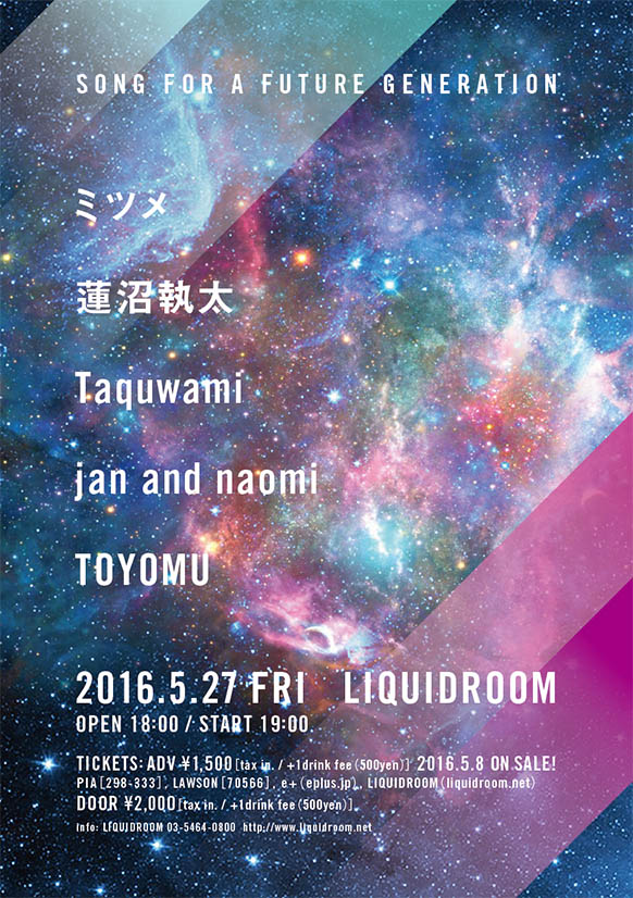 4月9日にagraph、D.A.N.、yahyelなどが出演し、インディ・ロック~電子音楽~ダンス・カルチャーと垣根を超えた新たな音楽の波を紹介、シーンの未来を感じさせるイベントとなった〈Song For A Future Generation〉。早くも第2回が決定! 今回もシーン/カルチャーの垣根を超えた「いま」「これから」の音楽が揃いました。唯一無二の存在感を示す音響感と間を備えたポップ・ソングを作るミツメ、6月に4枚目のアルバム「A Long Day」をリリースする直前に登場。TIDALのみでリリースされ、「日本にいたら聴けないよ~」状態のカニエ・ウェスト新作を巧みな妄想で再創造した『印象III ; なんとなく、パブロ (imagining “The Life of Pablo”)』が海外でも話題になった今日のトラックメイカー、TOYOMUがヴェールを脱ぎます! さらにはアンビエントから管弦楽、さらには電子音楽までさまざまな表現がありながら「歌」にフォーカスした『メロディーズ』をリリースした蓮沼執太。ベース・ミュージック~トラップなど、最新のビートフォームを乗りこなすTaquwami、空気までも彩る美しき旋律を作り出すデュオ、jan and naomiも登場。今回も前売り1,500円ポッキリで「いま」に根ざした未来ある音楽を体感ください。(河村祐介)
